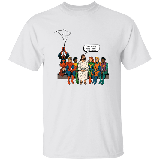 Jesus & Superheroes Christian T-Shirt (Adult TEE)– “And That’s How I Saved the World” Tee | Faith Humor Shirt | Christian Comic Style Graphic Tee